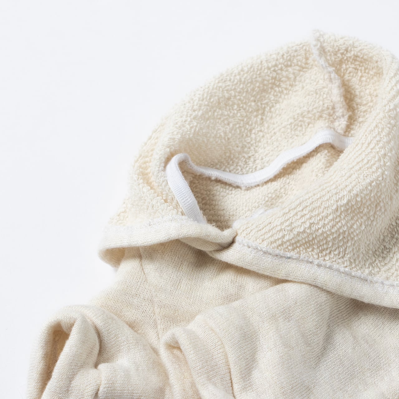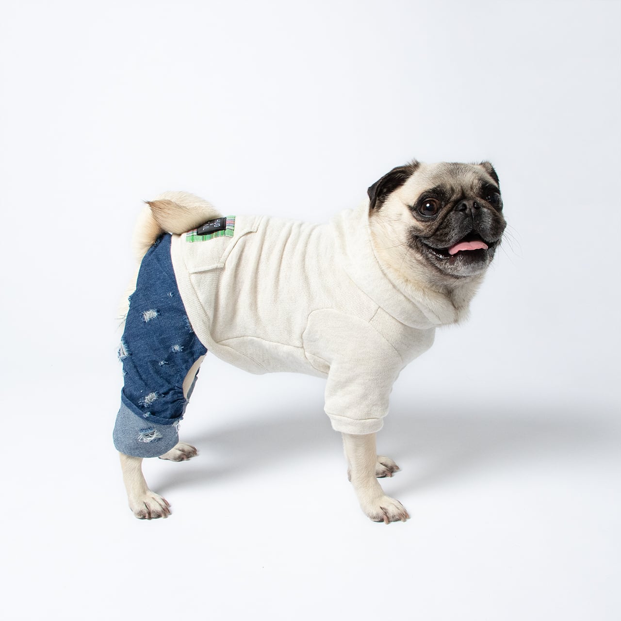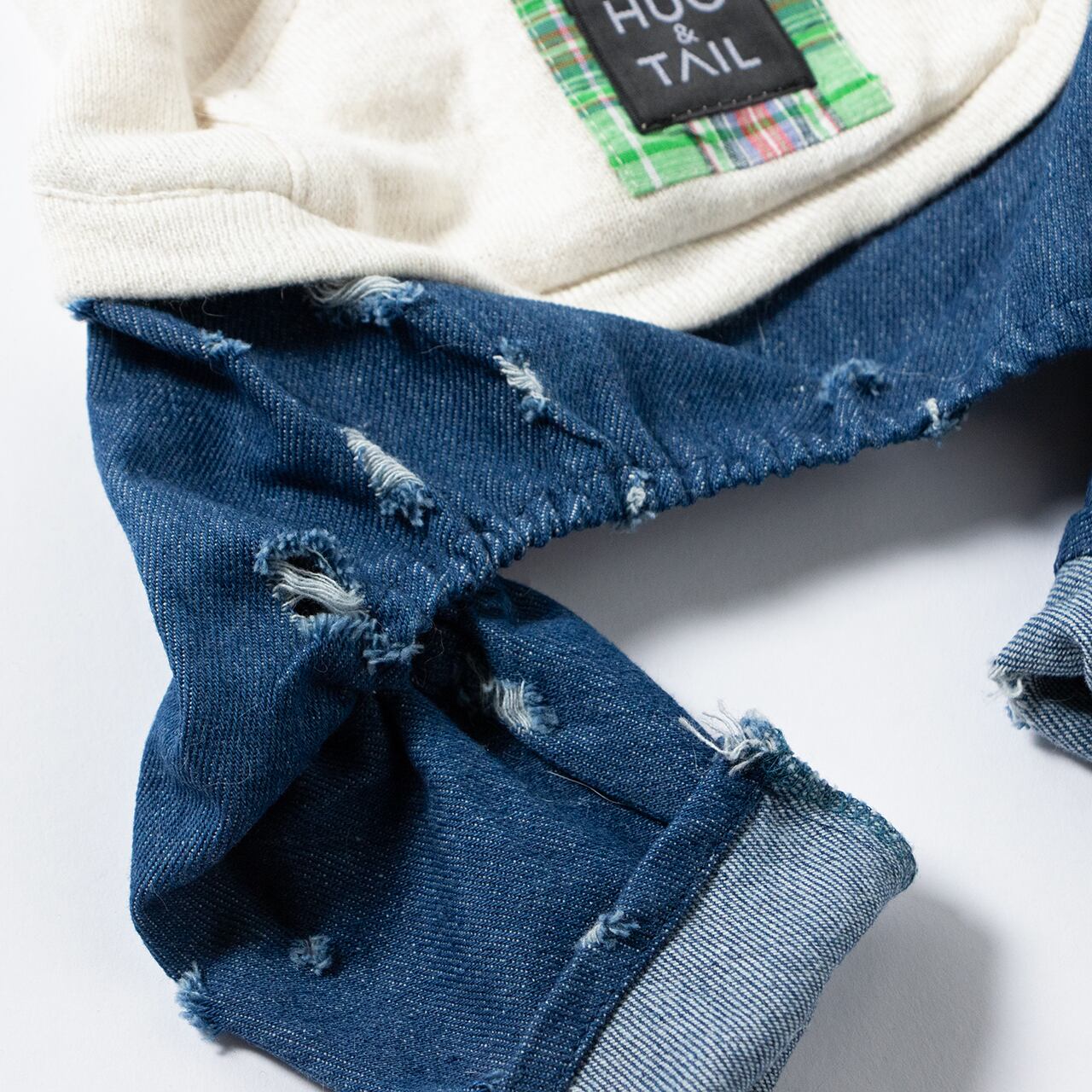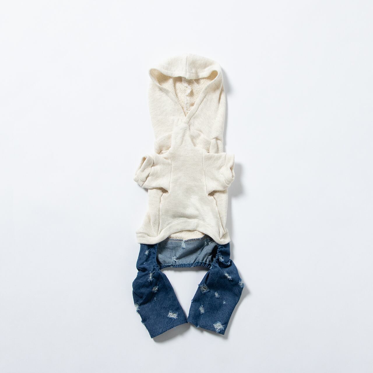 綿スウェットとダメージ加工デニムを組み合わせた、HUG&TAILらしい遊び心のある一着。フード付きトップとデニムパンツが一体になったシルエットは、愛らしさがありながら甘くなりすぎず、日常着として取り入れやすいバランスに仕上げました。やわらかな着心地と動きやすさにも配慮し、見た目だけでなく快適さも大切にしています。