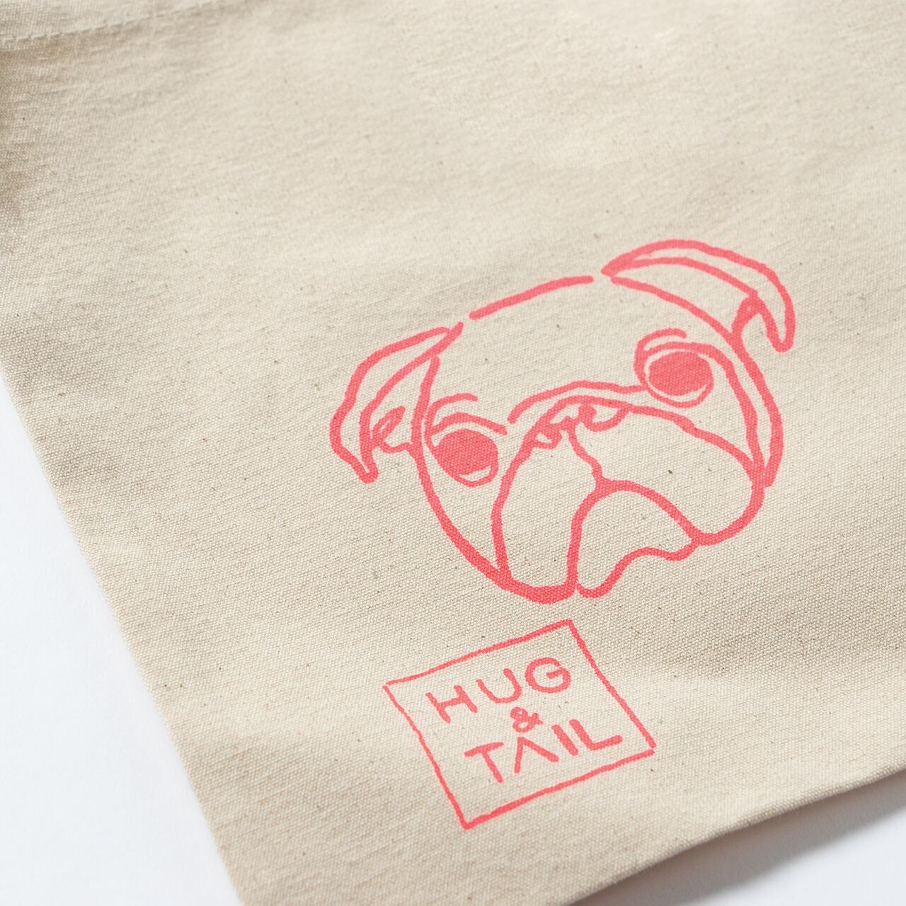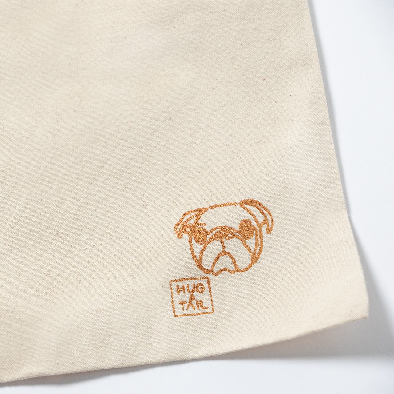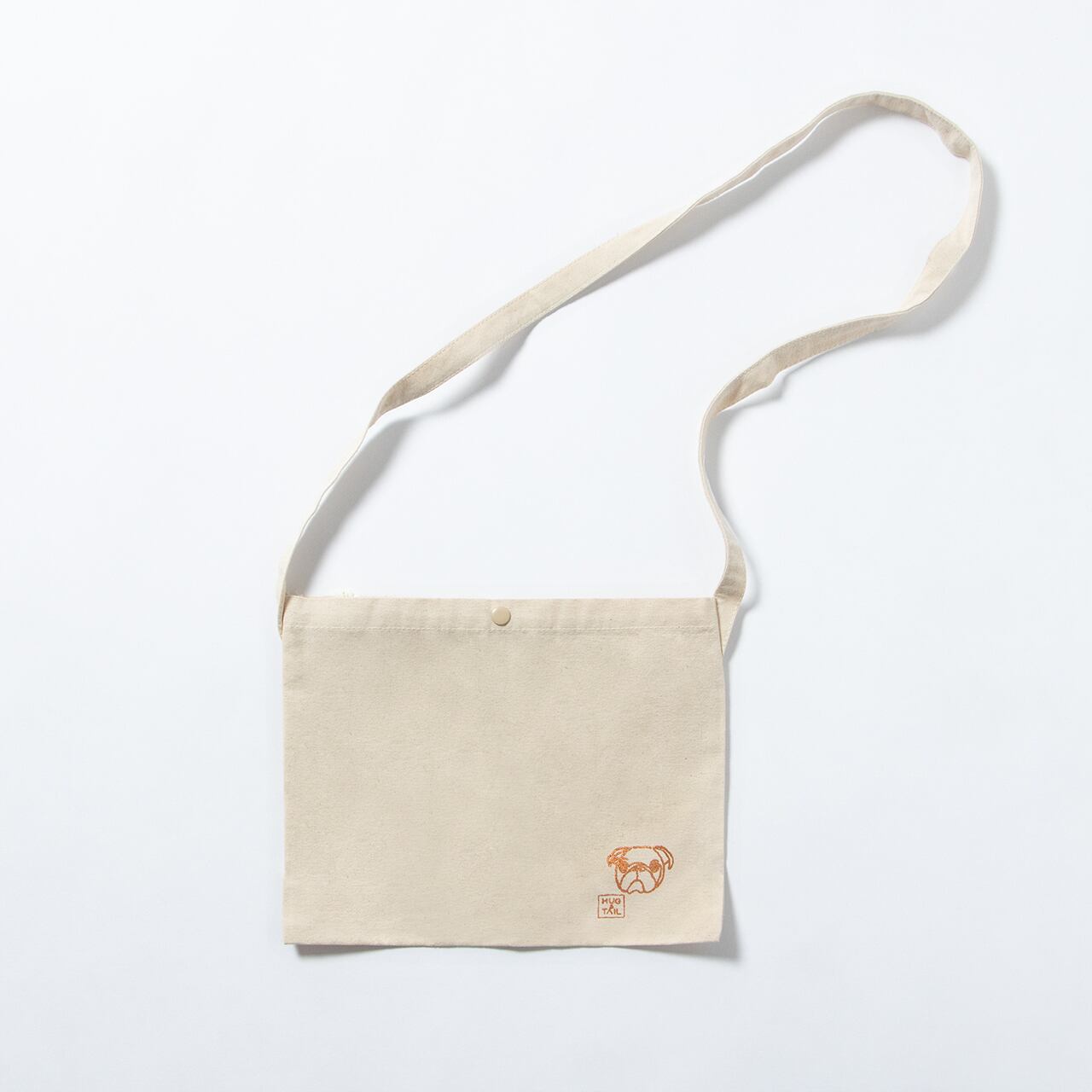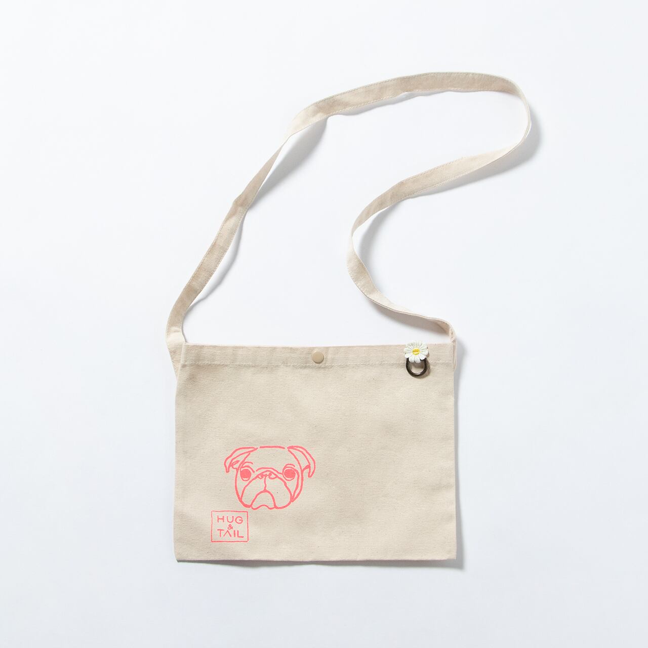 新しい線画イラストをあしらったサコッシュ。新しい線画イラストは、パグらしい横顔の愛嬌を描いたオリジナルデザイン。必要なものをさっと持ち出せる軽やかさと、日常に馴染むミニマルさを両立しています。